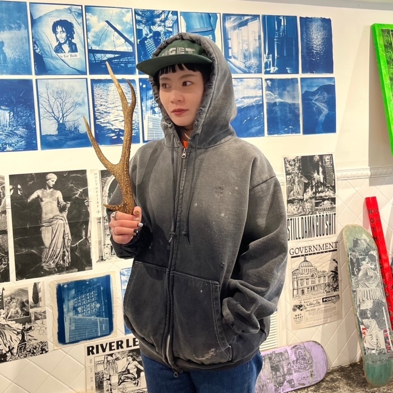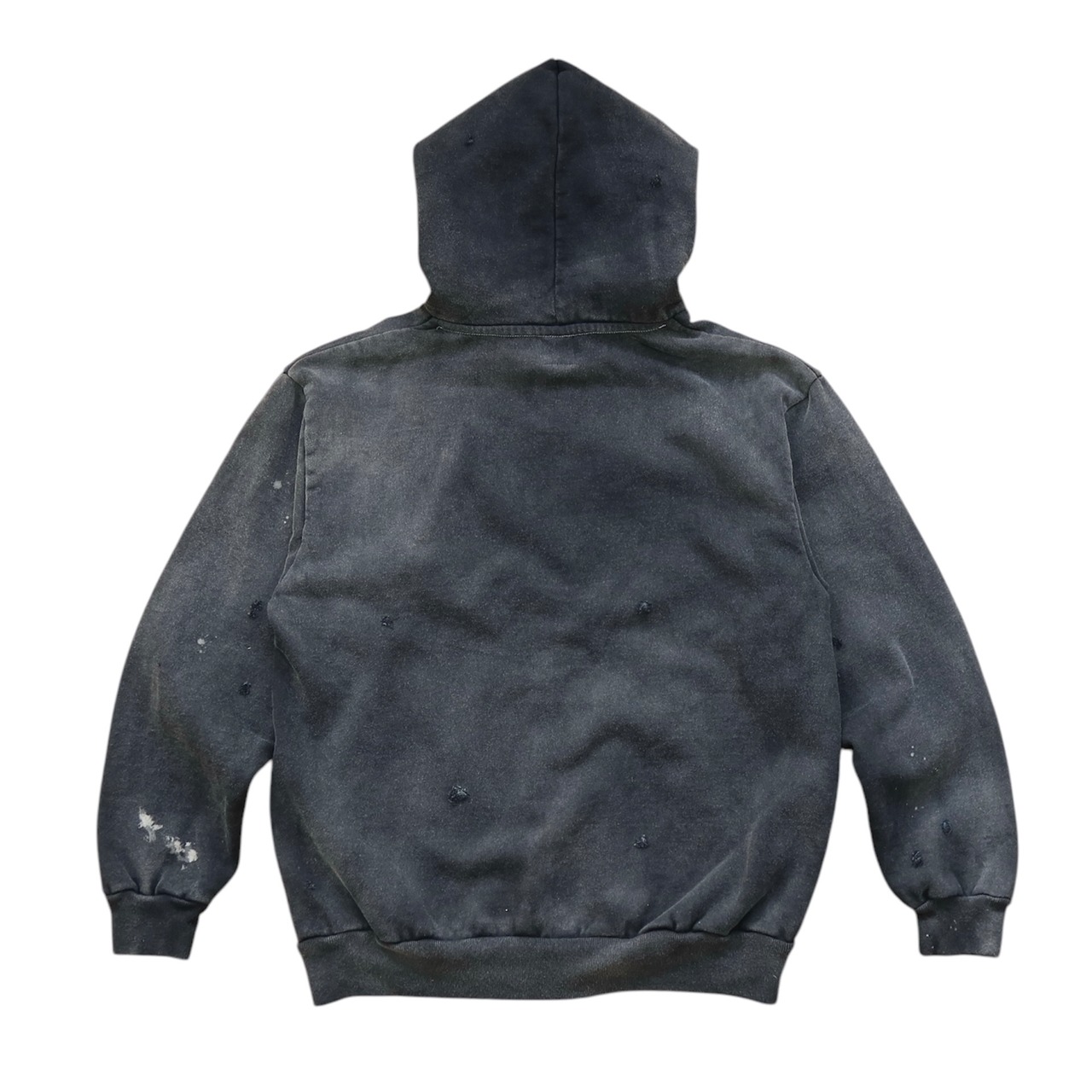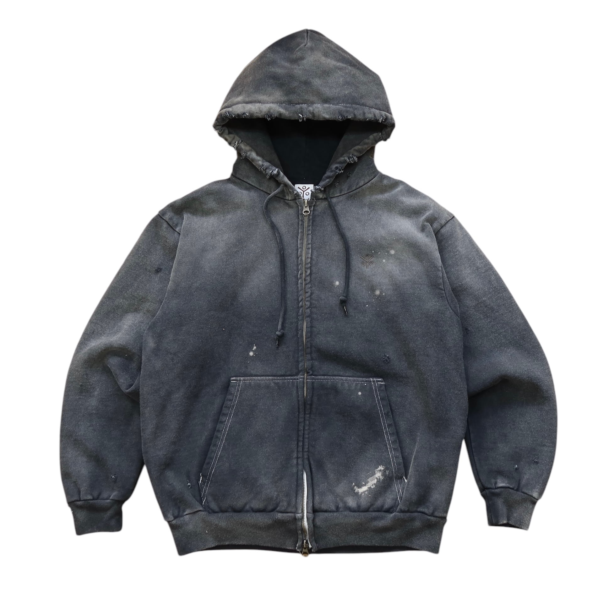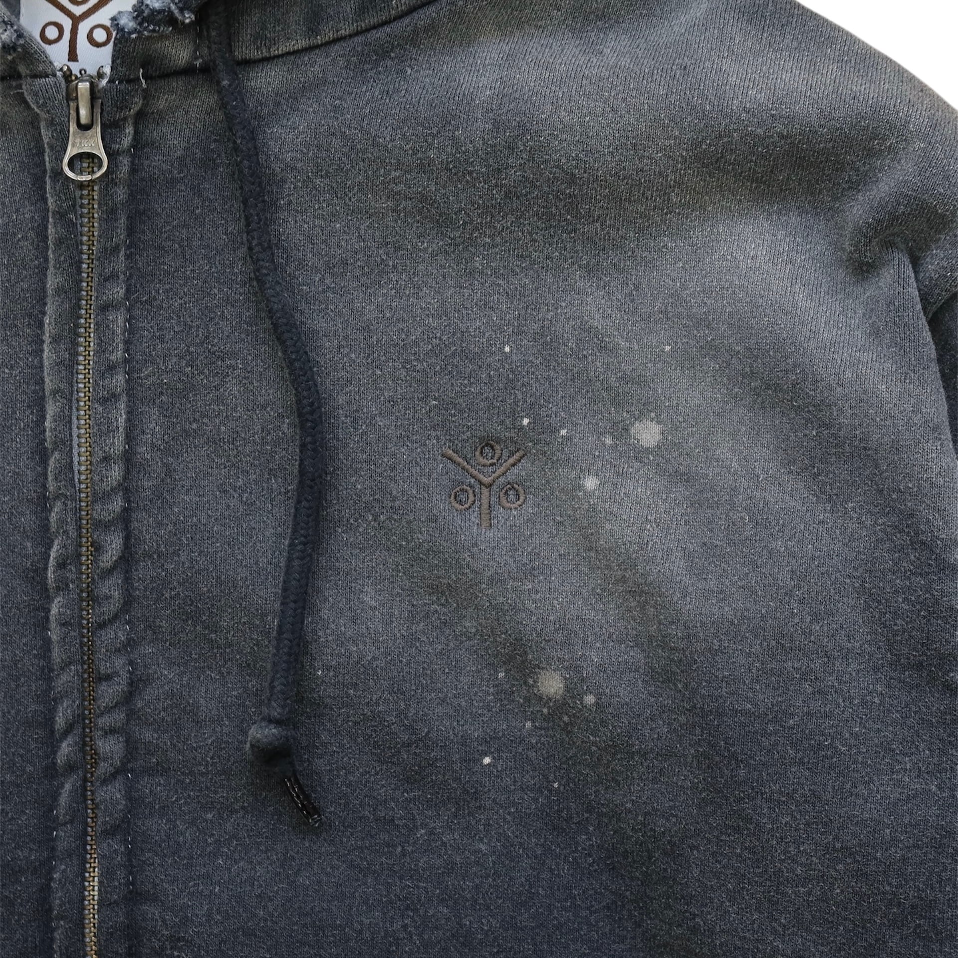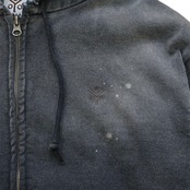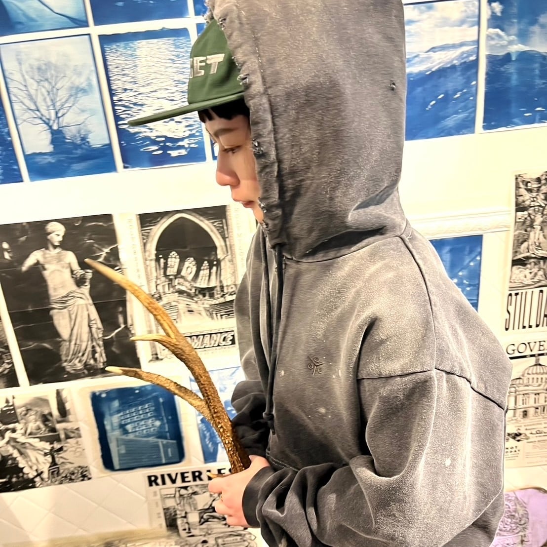 オープンエンド糸を使用した15.0オンスの厚手裏起毛スウェット生地を使用しています。製品硫化染めにてブラックに染め上げた後に、スプレーブリーチ、サンフェード、ダメージ加工を加えています。