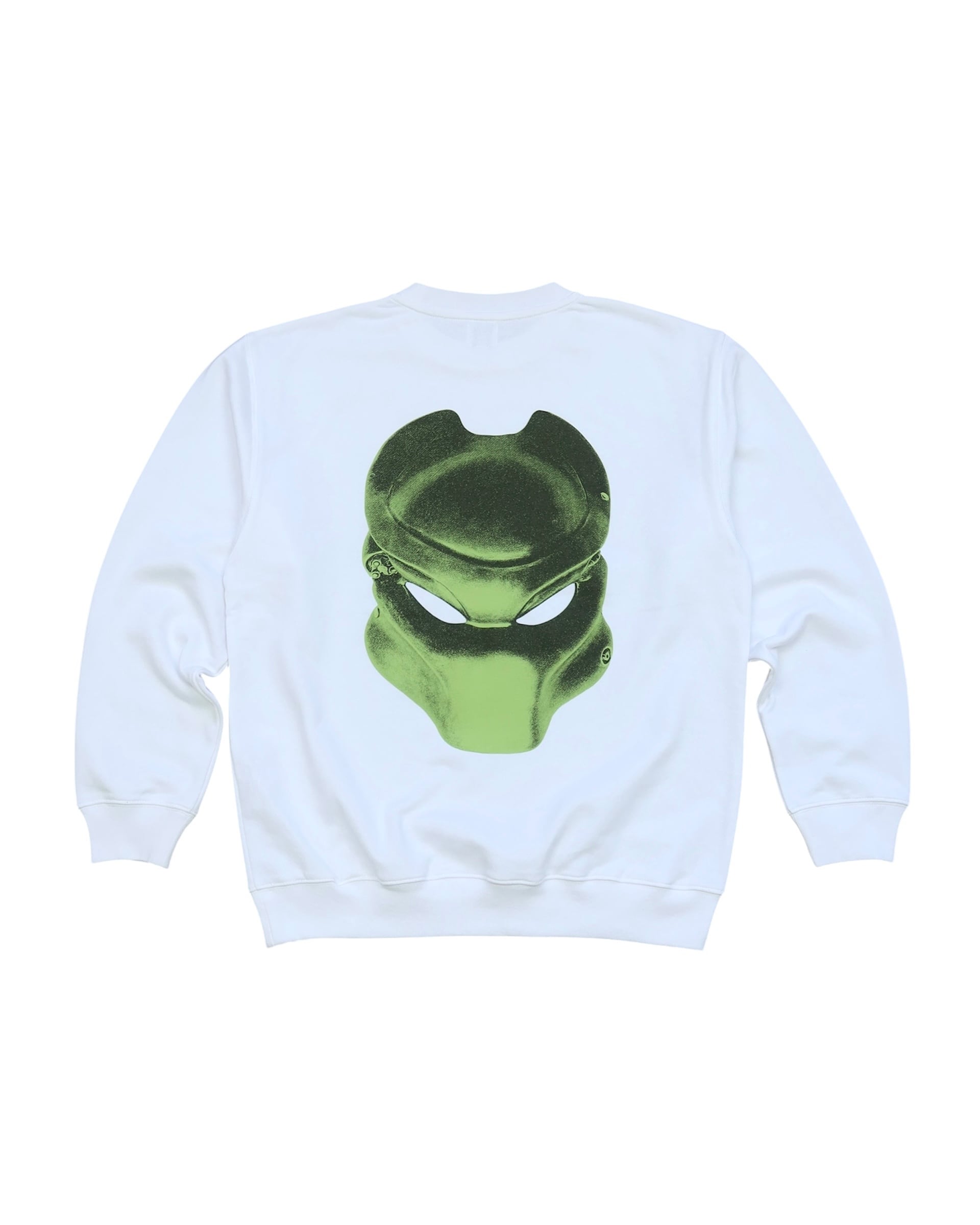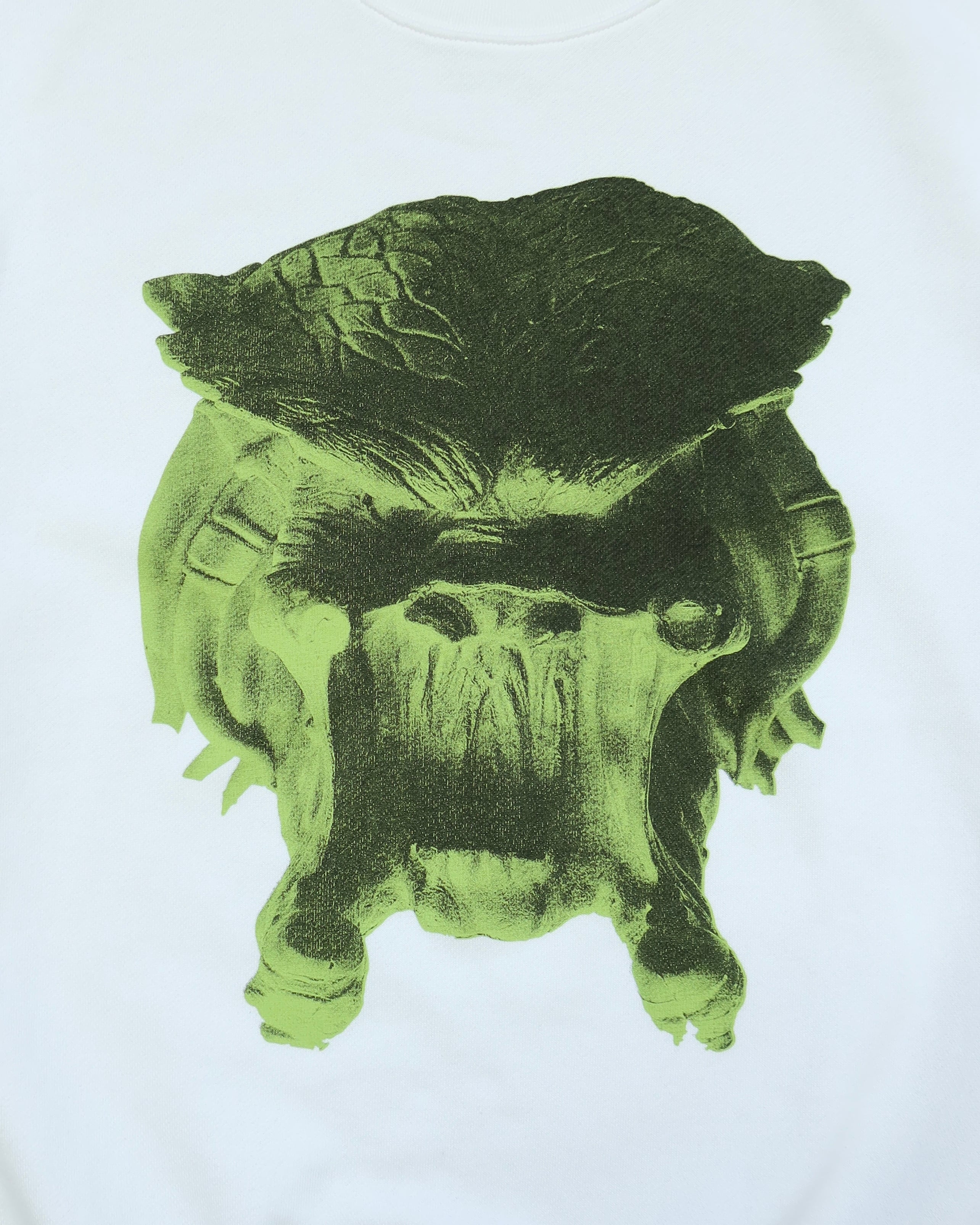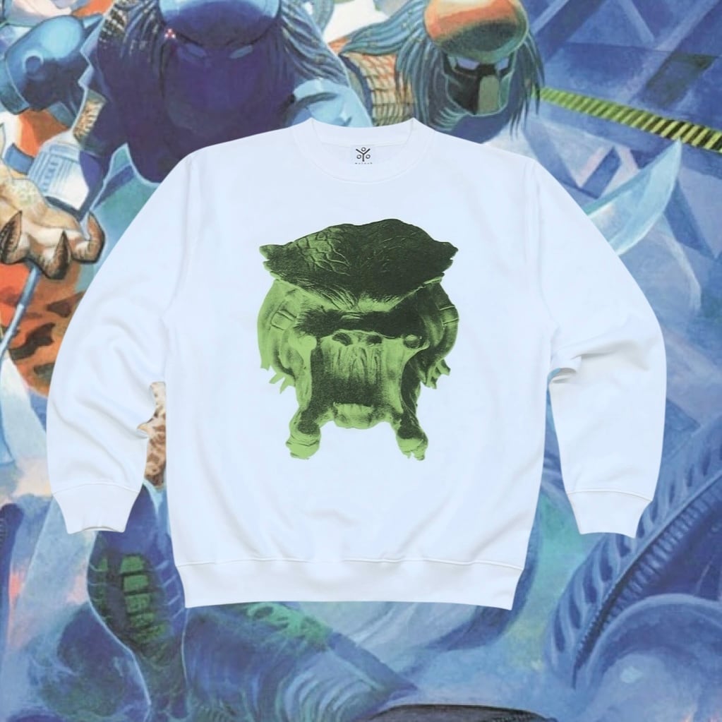 所有する某キャラクターのデスマスク&装備するマスクを撮影し、加工した写真をシルクスクリーンにてプリント。ホワイトは血をイメージしたアシッドなグリーン色をベースにプリント、アッシュは2作目で戦う舞台でもある近未来都市をイメージしたボディカラーを使用。裏パイルでほどよいやわらかさがありながら、薄すぎないしっかりとした厚みのスウェット。