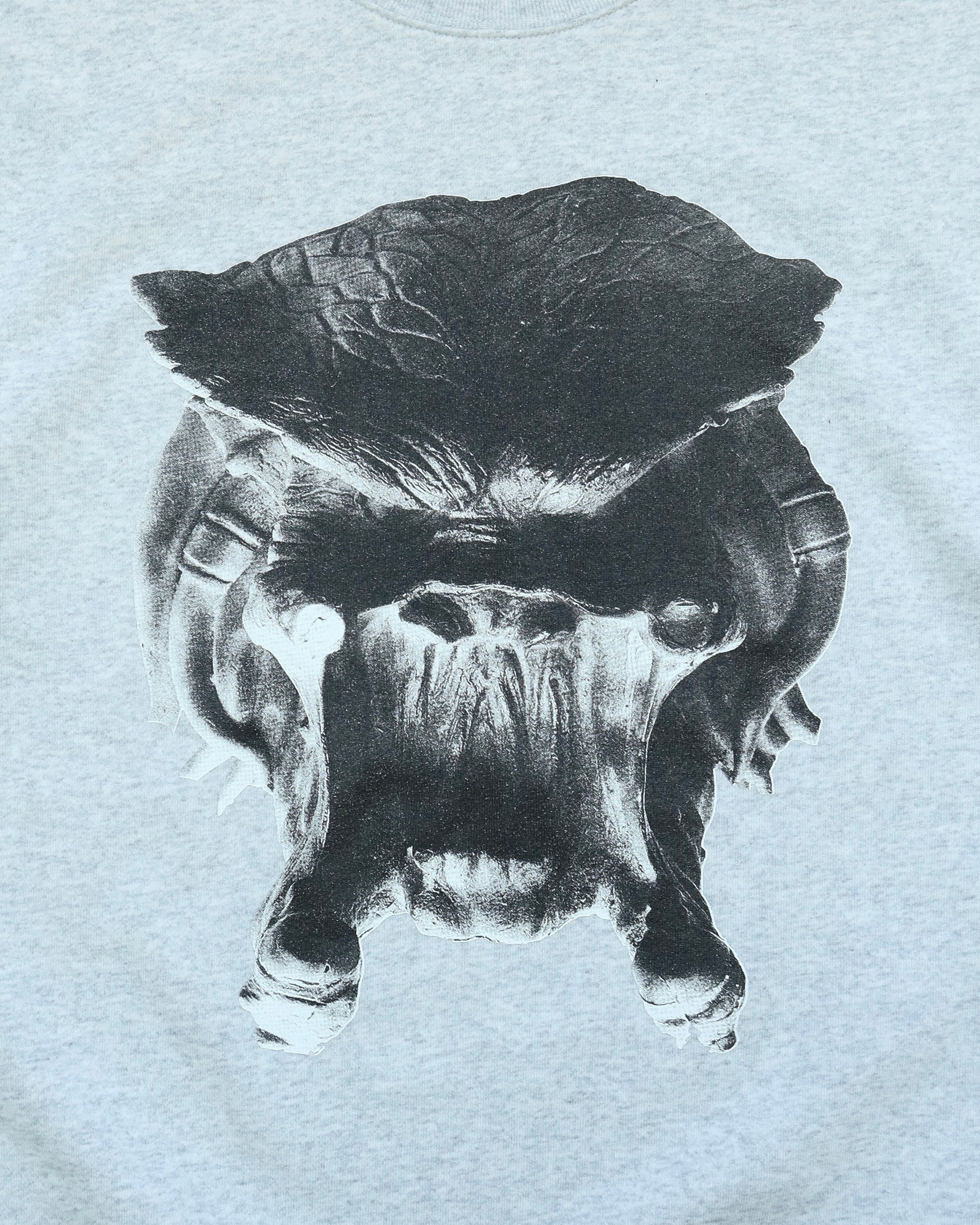 所有する某キャラクターのデスマスク&装備するマスクを撮影し、加工した写真をシルクスクリーンにてプリント。ホワイトは血をイメージしたアシッドなグリーン色をベースにプリント、アッシュは2作目で戦う舞台でもある近未来都市をイメージしたボディカラーを使用。裏パイルでほどよいやわらかさがありながら、薄すぎないしっかりとした厚みのスウェット。